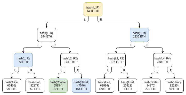 Merkle 树技术会将用户余额表放进 Merkle 总和树。在 Merkle 总和树中,每个节点都是对。底层叶子节点表示各个用户的余额以及用户名的加盐哈希。在每个更高层的节点中,余额是下面两个节点余额的总和,而哈希是下面两个节点的哈希。Merkle 总和证明和 Merkle 证明一样,是一个由叶子节点到根节点路径上所有姐妹节点组成的「分支」。