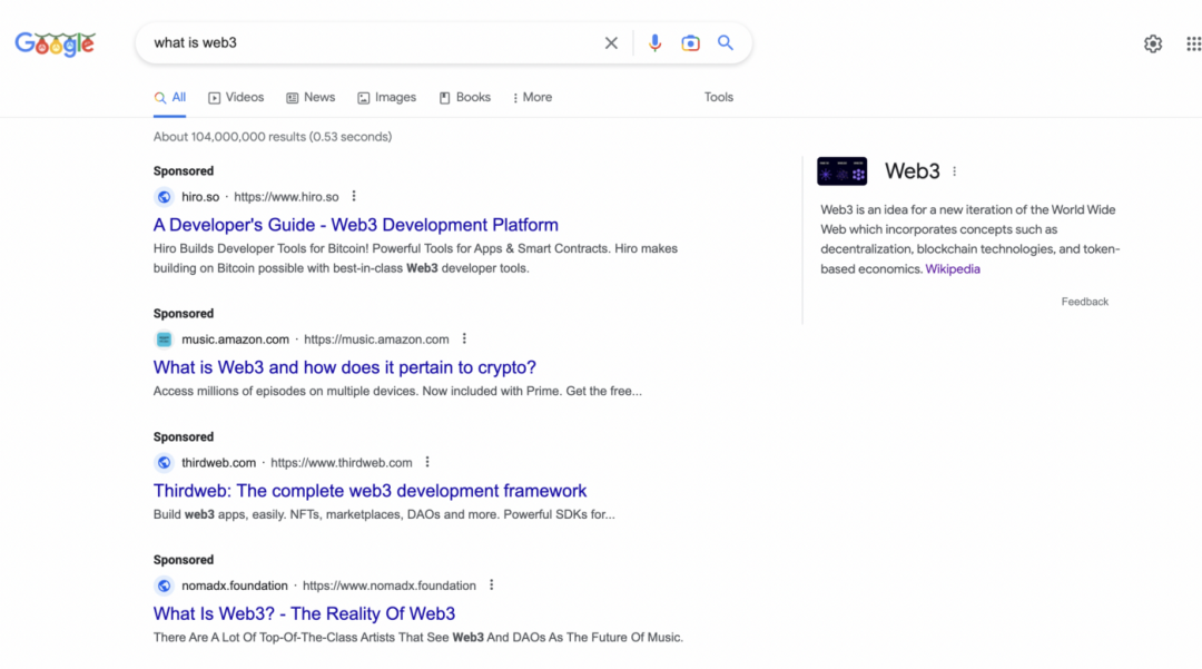 当然,有人会说网上有无数的资源——博客、视频、课程、游戏——旨在引导用户进入这个行业。但这一切都存在一个巨大的自我引导问题:我们从哪里开始?在谷歌搜索“什么是Web3”会给我们一堆广告,然后是维基百科的一个页面,里面有术语[2]: