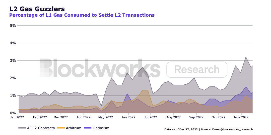 到 2022 年,随着不同的生态系统和社区开始形成,以及与以太坊 L1 相比显着降低的交易费用,以太坊上的第 2 层继续得到更多采用。L2s 消耗的以太坊 gas 总量的百分比在过去一年中稳步增长,其中 Optimism 和 Arbitrum 分担了大部分负载。