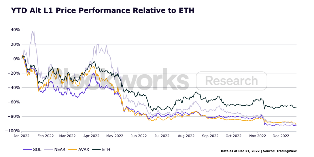 对于该行业的许多公司来说,今年是充满挑战性的一年,有几家著名公司破产,包括 FTX、Alameda、BlockFi、Celsius、Voyager 和三箭资本(3AC)。此外,许多比特币矿工、基金和其他加密货币公司一直在努力维持生计。许多“Alt Layer-1”,如 Solana、Avalanche、Terra 和 Near 都出现了重大损失,其中大多数经历了 90% 左右的 YTD 跌幅。