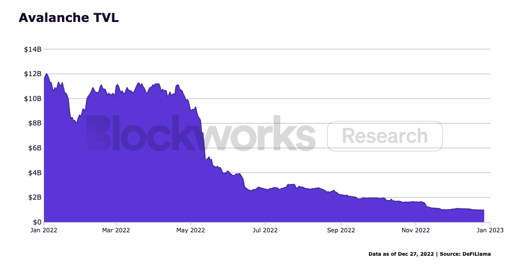 2022 年下半年,Avalanche 生态系统经历了一段相对停滞的时期。今年 6 月,作为该网络上构建项目的主要支持者的 3AC 的倒闭,导致 Avalanche 生态系统在风险规避环境下的投资减少。锁定的总价值(TVL)从 120 亿美元下降到 10 亿美元。Avalanche 的 TVL 下跌 92%,与其同期 AVAX 价格下跌 89% 保持一致。