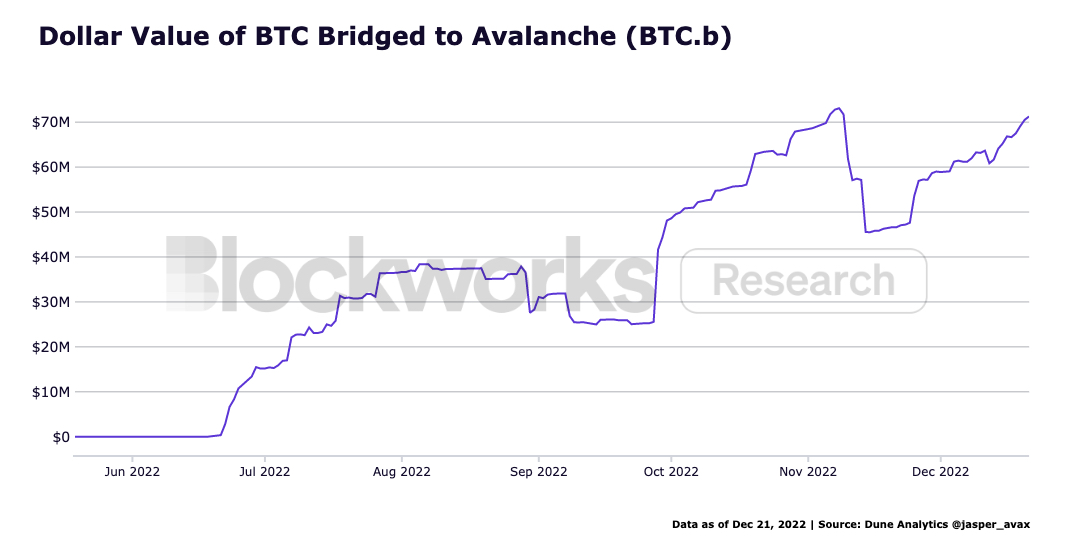 Avalanche 于 10 月 18 日成功实施了Banff 升级,这是向称为 Avalanche Warp Messaging 的子网到子网通信迈出的一大步。通过子网互操作性,该网络可能成为 Cosmos 更重要的竞争对手。Avalanche 于 6 月推出了原生 BTC 桥 BTC.b,该桥在 2022 年的最后 6 个月中得到了广泛采用。
