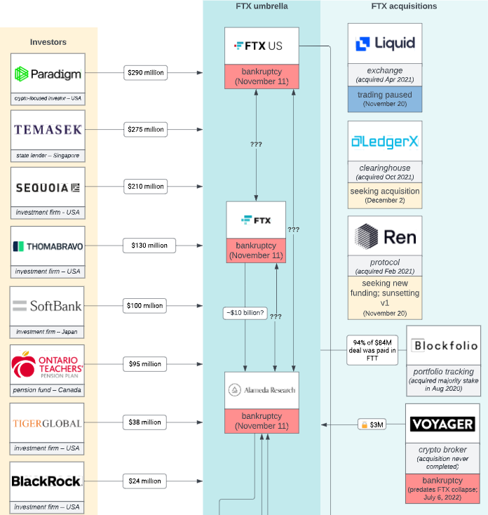 在这里只是叙述了 FTX 事件本身,而这起黑天鹅事件引发的多米诺骨牌效应,更是惨不忍睹或仍有许多未被揭露。加密研究员 Molly White 制作了 FTX 的扩散关系图,呈现 FTX 与不同机构间的资金关系。