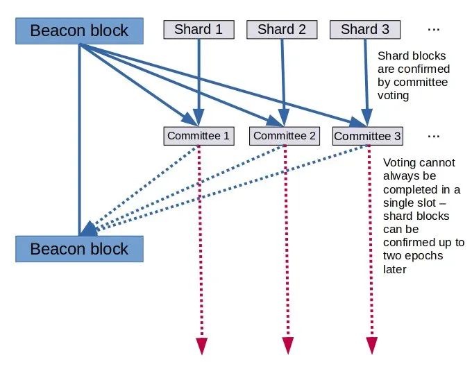 此版路线图采用的分片机制指的是对数据库进行横向分割,即每条分片链都拥有一个节点子集,在该链上进行工作。64 个分片区块都有各自的提议者和从验证者集中通过随机分配组成的委员会,他们独立验证可用的分片数据。在这个设计里,所有分片是无法得到整体验证的,而且每个提议者都有能力破坏整个流程。在分片间混洗验证者也相当麻烦。而且除非引入非常严格的同步假设,否则很难保证投票能在一个 slot 里完成。