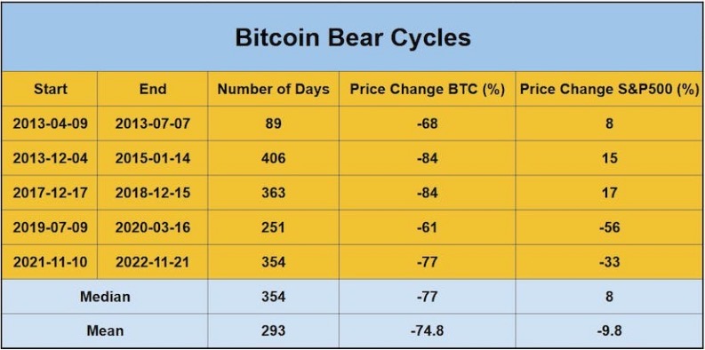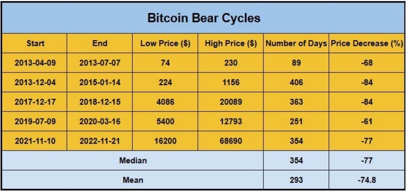 从以上数据可见,在之前的熊市周期中,回撤幅度中值为 -77%(平均约为 -75%)。最近的熊市周期价格正好下跌了 77%。另一方面,牛市中的价格涨幅中值为 15 倍,平均约为 60 倍。
