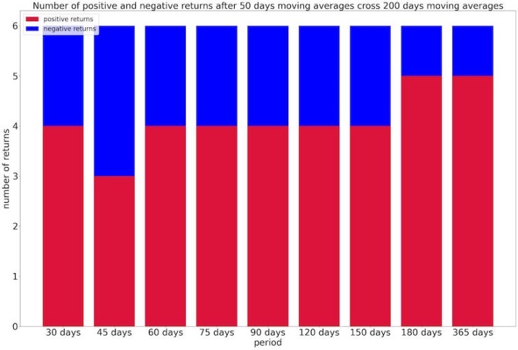 在比特币的整个历史中,50 日均线只有 6 次突破 200 日均线。从概率上讲,交叉事件发生一年后有超过 80% 的正向回报可能性。