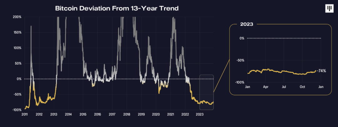 放大比特币对数趋势图,你可以看到2023年反弹只是正常现象--黄金线几乎没有超过13年趋势。