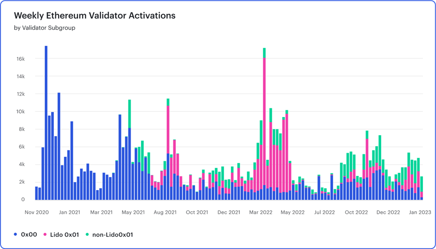 从图 2 中可以看出,大约 20% 的新激活的验证者仍然将他们的提款凭证设置为旧的 0x00-类型。这可能是由于独立质押者或机构使用过时的指南来激活验证器,也可能质押者有意做出的决定,他们希望避免从部分提款中自动获得流动资金的任何潜在税收影响。请注意,在许多司法管辖区,质押的税务影响还没有明确的定义,这不是税务建议。税收规则因司法管辖区而异,应咨询您所在司法管辖区的认证专业人员以获得建议。