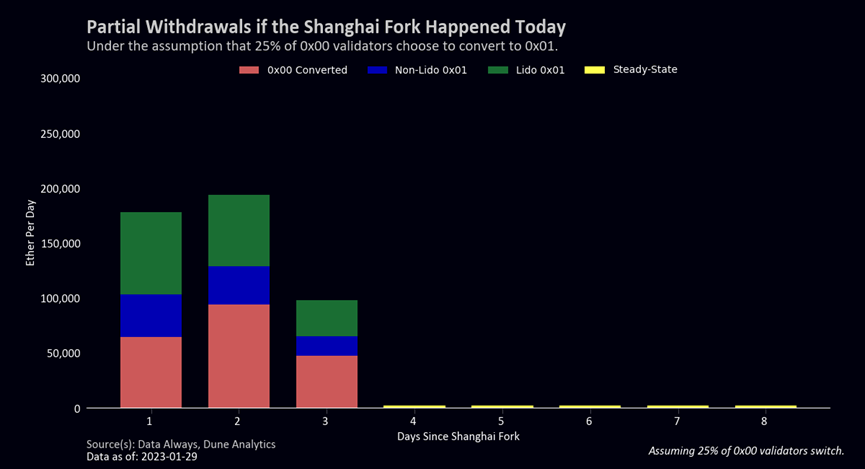这个范围的低端(2 天)假设没有一个 0x00 认证的验证者更新为 0x01 认证,使他们没有资格提款。较高的一端(5 天)假设所有 0x00 认证的验证者立即更新。实际情况可能介于两者之间,但没有数据支持具体的估计。