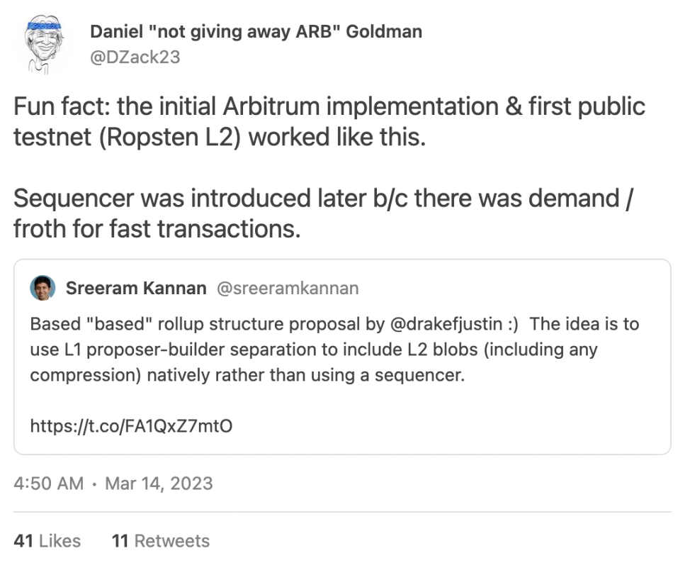 例如,备用排序器可以由 Rollup 治理机制选出,用户可以获得安全性、抗审查性和活性。即使从长远来看,单个主动排序器也是一个可行的选择。