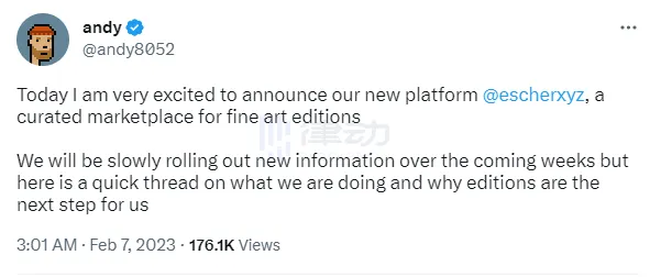 Tessera 的创始人 andy 认为:tessera 所做的事情与版画有很多重叠之处,版画实际上是艺术品的另一种集体所有权形式。他在推特上说:「去年夏天,我们就开始探讨版画市场存在许多未被满足的需求,以及如何与艺术家和用户合作满足这些需求。为此,我们在去年 11 月开始建设 Escher。」