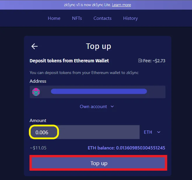 4. 从以太坊主网跨链一些 ETH 到 Zksync 主网