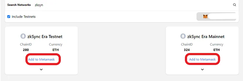 4. 搜索 “ZkSync” ,点击 “Add to Metamask” 添加这两个网络。