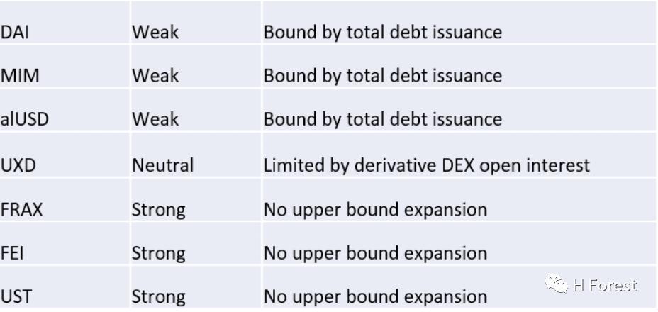 FRAX:FRAX 在支持其 Token 的外生 USDC 中具有「强」稳定性。如果价格低于 1 美元,则有直接激励措施,有助于重振挂钩,但其中一个固有问题是,这些激励措施通过协议设计需要一段时间才能生效。