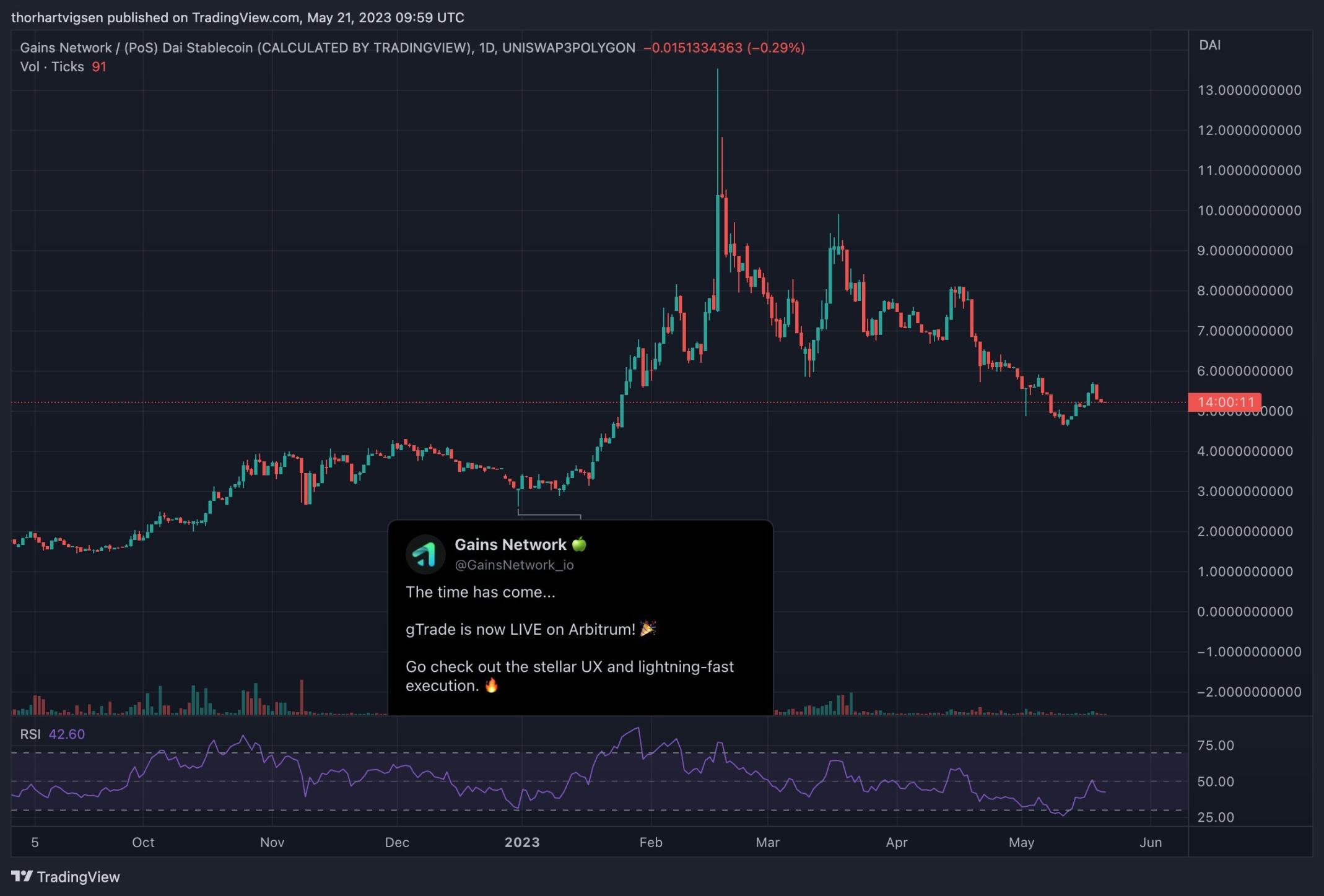在 Arbitrum 上线改善了 GNS 的基本面,引发代币大幅反弹,并在上线币安当天达到顶点(常见的顶部信号)。