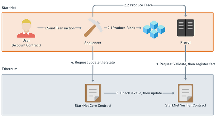 相信大家都知道扩容的其中一个大方向就是“把繁杂的计算丢到 Off-Chain 并且只要在 On-Chain 做验证即可”,而 StarkNet 作为 ZK-Rollups 一员,他会将 Cairo 撰写的 ZK-STARK Program 执行完的内容透过 STARK-proof system 进行证明(prove)与在 Ethereum 进行验证(verify)。