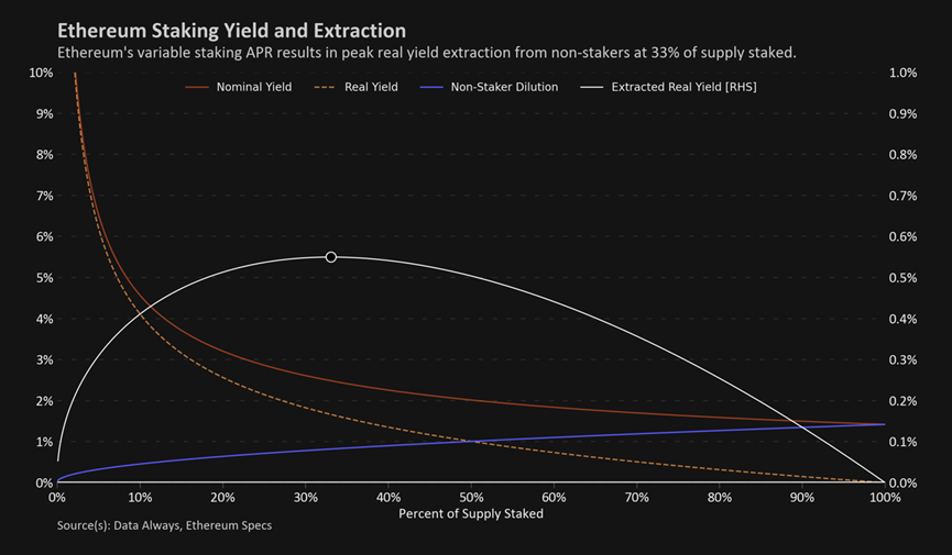 我已经在之前讨论过这一概况,但为了简要地提醒读者提取的实际收益率曲线是如何工作的,我们应该首先意识到,质押的回报纯粹来自于其他持有人和验证人的稀释。如果一个行为人拥有并质押流通中的每一个 ETH,他们将只是自我稀释,因此将获得零的实际收益。同样地,如果没有人确保网络的安全,那么就没有人赚取收益。这两个边界条件在 0% 和 100% 的供应量被质押时,意味着我们在上图中绘制了一个收益率提取的最大点。