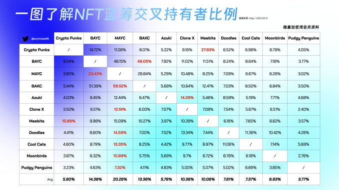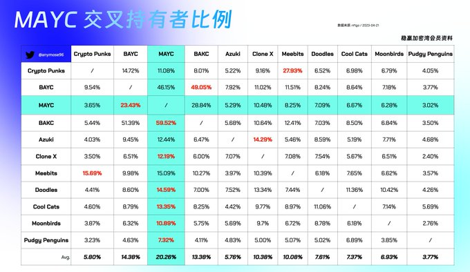 据基础数据,我做了一张表,主要统计NFT持有者同时持有其他蓝筹的情况,发现了一些非常有趣的现象,包括: