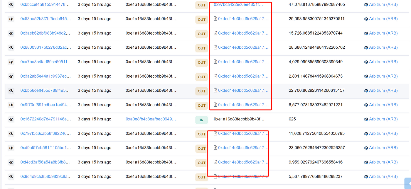 3. (图3) 0xe1a — 收到222个空投地址的401,000个$ARB,最后将所有$ARB分多次转移到其他地址。