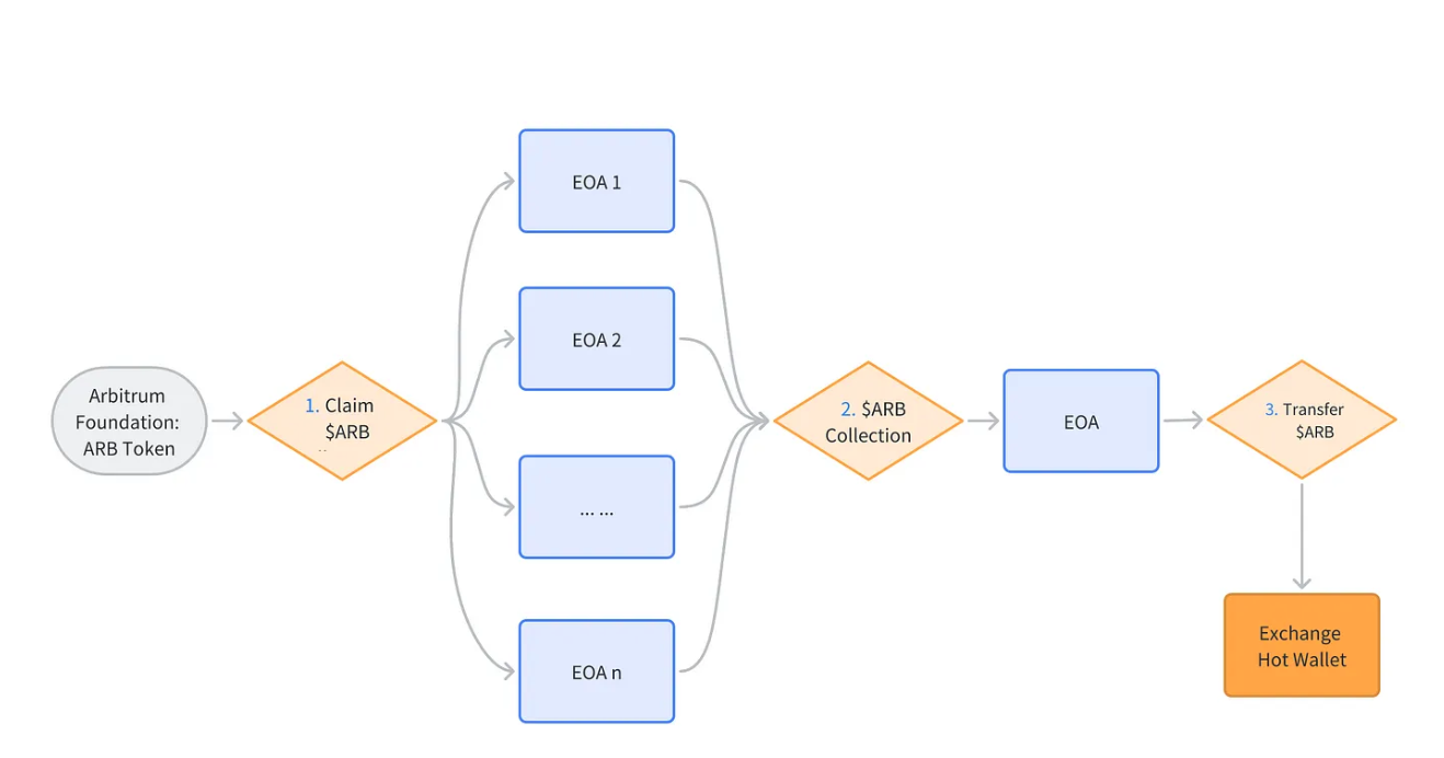 2. (图2) 在Arbitrum本轮空投中,该目标地址将自己Claim的$ARB,以及另外一个地址转入的$ARB转到归集地址0xe1a —