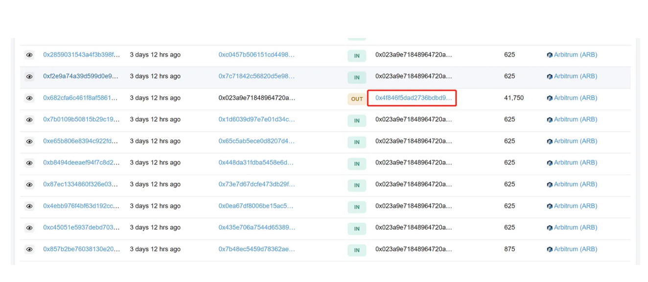 3.(图3)0x023 — 收到425个空投地址的总共437,500个$ARB,最后将所有$ARB分多次转移到其他地址。