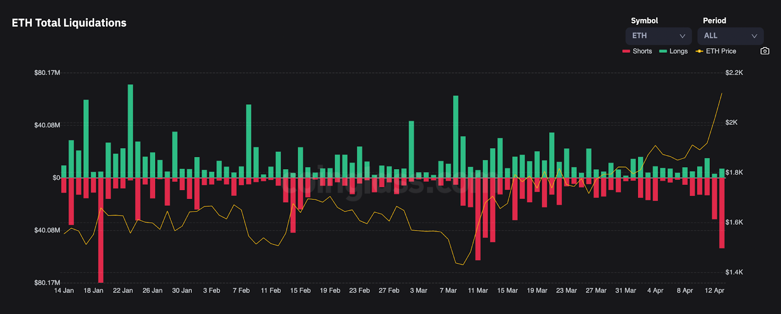 自升级上线以来,ETH 已经咆哮起来,从 1871 美元飙升至撰写本文时的 2117 美元,涨幅达 13.1%. 这一举动留下了一串熊的尸体,导致 4 月 12-13 日期间价值超过 8470 万美元的空头清算。这是自 3 月 12-13 日以来我们看到的最多的两天时间,当时 ETH 在 USDC 脱钩和银行危机后反弹。