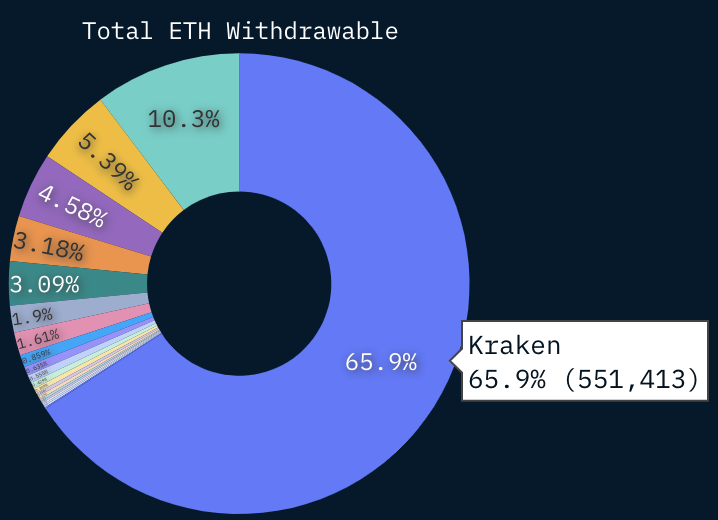 Kraken 代表了绝大多数的退出(65.9%),因为它与 SEC 的和解要求关闭美国的质押业务。然而,这些客户中的大多数(可能与其他供应商成正比)可能会重新入股,因为和解并没有改变 ETH 入股的基本好处。