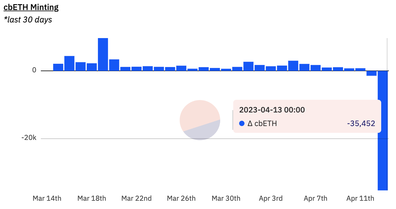 Coinbase 的质押项目,允许用户铸造他们的 cbETH 质押衍生品,是一个例外,在上佩拉之后的用户赎回了超过 35.5k cbETH. Coinbase 占退出队列的 10.3%,代表了另外 86k 的全额以太币提款。然而,在这个计算中,包括了 LSD 以外的产品的退出,如机构质押。