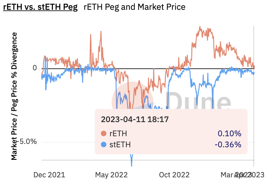 Balancer 的 wstETH/sfrxETH/rETH(41.0% wstETH)和 wstETH/cbETH(56.6% wstETH)池,以及 Curve 的 wETH/stETH 集中池(64.5% stETH),都表明 Lido 的质押衍生品面临巨大的卖压。这一论点的进一步证据可以从 stETH 与质押的偏离中找到。目前,stETH 以 0.36% 的折价交易,而 rETH 的溢价为 0.10%,测试了 3 月银行危机后建立的下限。