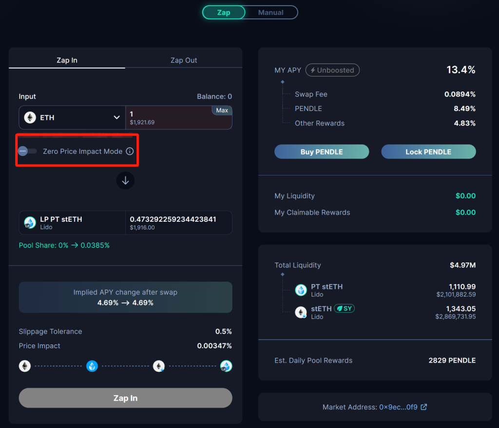 - 如果用户选择“零价格冲击模式”(zero price impact mode),则Pendle会在第三步中,将一半的sy-stTH分拆成为收益代币YT-stETH和本金代币PT-stETH,并将PT-stETH与另一半sy-stTH组合成LP放入池子中,收益代币YT-stETH存放在用户账户中;如果用户不选择“零价格冲击模式”,则Pendle会在将PT-stETH与另一半sy-stTH组合成LP放入池子中的同时,把YT-stETH自动卖出,并将获得的资金购买更多PT-stETH。如果用户选择“manual”,则上述步骤都需要用户手动操作。