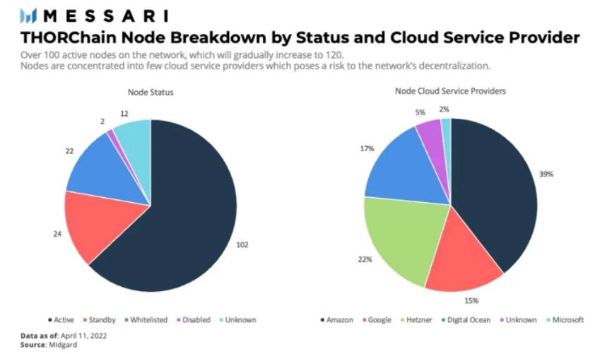 目前, THORChain 上有 162 个节点,其中 102 个处于活动状态。运行节点需要为网络本身运行一个 THORNode,并为网络支持的每个区块链(比特币、以太坊等)运行完整节点。因此,运行全节点对硬件的要求很高,导致大多数节点使用云服务提供商。由于大部分节点依赖于相同的云服务提供商,因此团队正在制定计划以防止单个云提供商能够关闭网络,社区还在考虑在未来利用 Akash 网络作为中心化云提供商的替代方案。