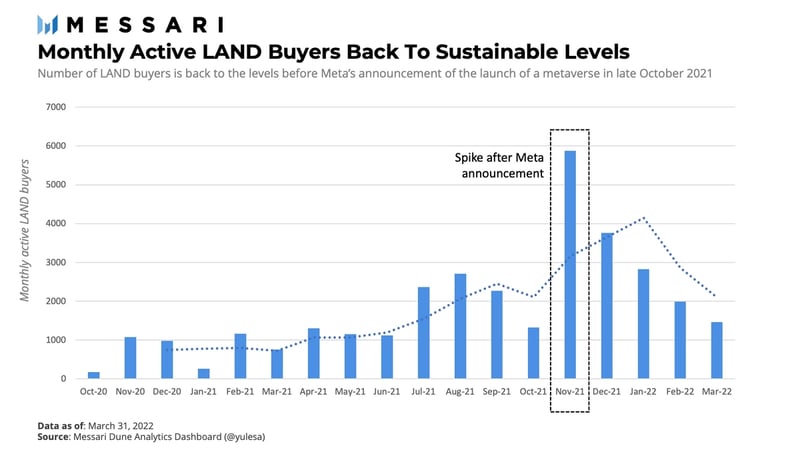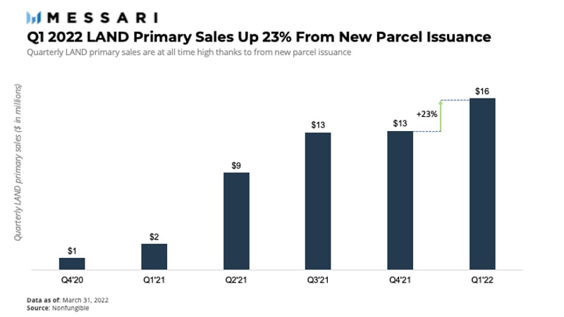与此同时,相对于 2021 年第二季度,初级 LAND 销售增长了 23%。初级销售的对象是新发行的 LAND 地块,通常出售给合作伙伴或通过拍卖。尽管如此,2021 年第一季度,主要 LAND 销售额(1600 万美元)仅占市场 LAND 总销售额(1.36 亿美元)的 12%。