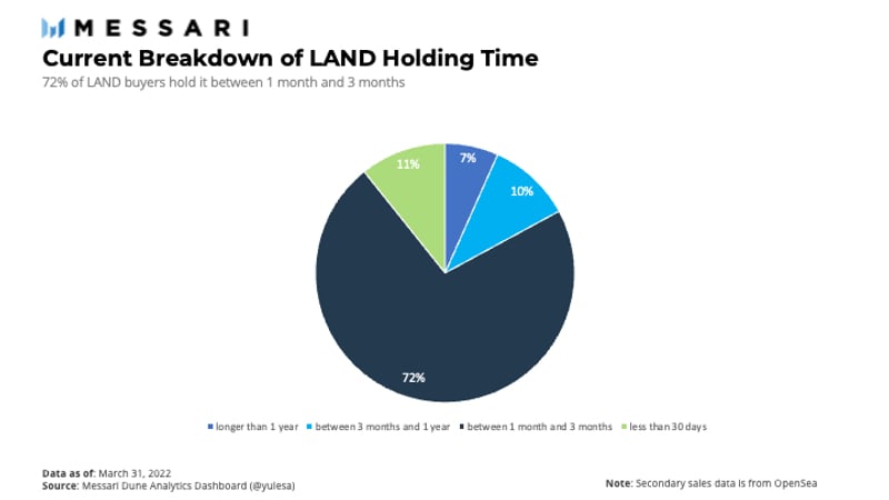 为了了解 LAND 持有时间,可以考虑不同的购买和持有行为集群。从这个意义上说,例如,可以将长期购买行为视为持有地块超过一年,而购买和出售可以视为持有期限少于 30 天。目前对 LAND 持有时间的细分显示,7% 的购买者持有 LAND 超过一年,而 11% 的购买者持有 LAND 不到 30 天。同时,绝大多数(72%)LAND 买家持有资产的时间为 1-3 个月。